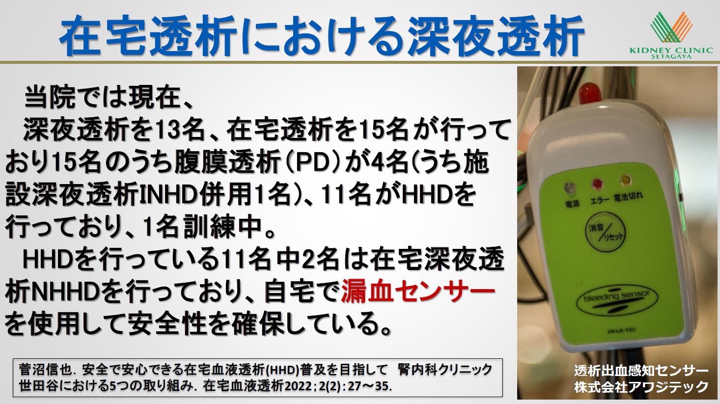 1)菅沼信也.安全で安心できる在宅血液透析(HHD)普及を目指して 腎内科クリニック世田谷における5つの取り組み.在宅血液透析2022;2(2):27-35.