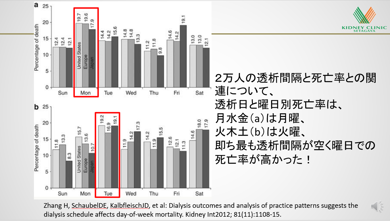 3)Zhang H, Schaubel DE, Kalbfleisch JD, et al: Dialysis outcomes and analysis of practice patterns suggests the dialysis schedule affects day-of-week mortality. Kidney Int 2012; 81(11):1108-15.