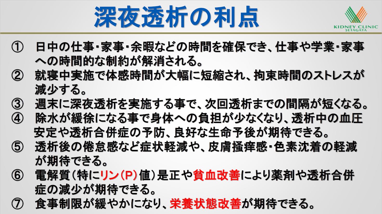 オーバーナイト透析の利点は、十分な透析時間を確保できることによる治療的観点からの良さ(長時間透析の良さ)と、生活の中で時間の有効活用ができる良さの双方を含む以下の7点があげられます。