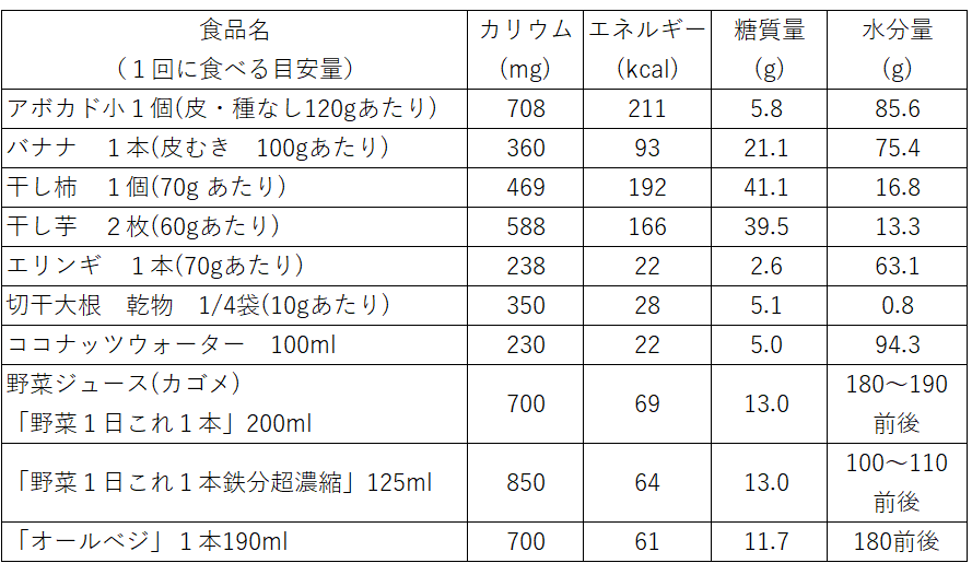 Kは野菜や芋類などの植物性食品をはじめ、蛋白源となる肉、魚、卵、大豆製品など様々な食品に豊富に含まれています。低K血症にならないためにKを多く含む食品を紹介します(下表)。エネルギー、糖質量、水分量も記載しましたので、目的に合わせて選んでください。生の果物はKを多く含みます。ドライフルーツなどの乾物類は水分が抜けている分、少量でもK量が多くなりますが、糖分が多くなります。血糖値を下げる糖尿病治療を行っている場合や高度の肥満を認める場合は、量の加減が必要になります。きのこ類では、他の種類と比べてエリンギに多くKが含まれています。濃縮タイプの野菜ジュースは少ない水分量でKが多く含まれます。菅沼のいとこがカゴメに勤めています。カゴメの「超濃縮」シリーズは、1パック125mLと少量ですが、水分と糖分も少ない製品です。透析間体重増加が気になり、水分量を控えたい方にもおすすめです。
