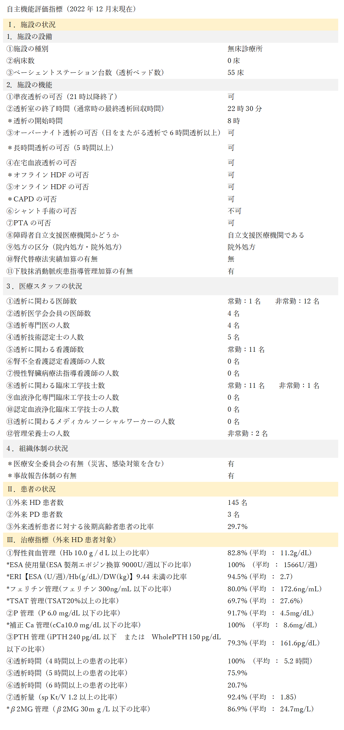 日本透析医会は自主機能評価指標の項目を選定し、自律的に自らの診療内容や医療の質の評価を公開することを勧めており、本院でも選定され令和2年に項目が見直された全ての評価指標項目と*で示したその他の項目についても公表しております。