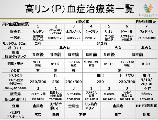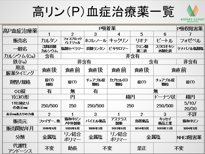 上記の代謝性アシドーシスは、血液ガス分析装置を有する本院でも血液検査にて即時診断が可能であり、腎不全患者様で認められることも多い代謝性アシドーシスの程度の評価を、本院透析患者様を含む慢性腎臓病(CKD)患者様に対し適宜行っており、高P血症治療薬選択における判断の材料にも致しております。下記に第68回 元気で長生き講座(2017年8月号)のP吸着薬一覧5)をアップデートした最新の高P血症治療薬の一覧を掲載します。高P血症に対する新しい治療薬として、フォゼベルR錠が新たに発売されました。フォゼベルRは、透析患者様の腸の中のPが血液中に移動するのを抑えて、 血液中のP濃度が上昇しないようにする薬です。1回5mgを開始用量とし、1日2回、朝食及び夕食直前に経口にて服用します。今までのP吸着薬(カルタンR、フォスブロックR/レナジェルR、リオナR等)が消化管内でリンを金属などに吸着させることによりに消化管内での吸収を抑制するのに対し、フォゼベルは、小腸の主に細胞と細胞の隙間を通りにくくしてPの吸収を阻害する新しい機序の高P血症治療薬です。今年発売されたばかりの新規治療薬の為、来年迄は最大2週間迄の処方となります。高P血症治療薬に関してご質問、ご相談のある方は、本院医師または看護師にお申し出下さい。