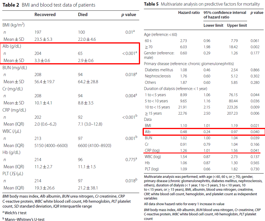 透析治療における生命予後との関連についても多くの報告があります。Maryam Pakfetratらの研究1)によると、透析低血圧と低Alb血症とCRP高値が関連しており(低Alb血症に伴う血管内の膠質浸透圧低下が血液透析時の除水に伴う血圧低下を引き起こしてしまうことが考えられます)、また菊池勘先生らの研究2)では低Alb血症とCRP高値が新型コロナウイルス感染症(COVID-19)罹患後死亡と関係していることが明らかとなっています。