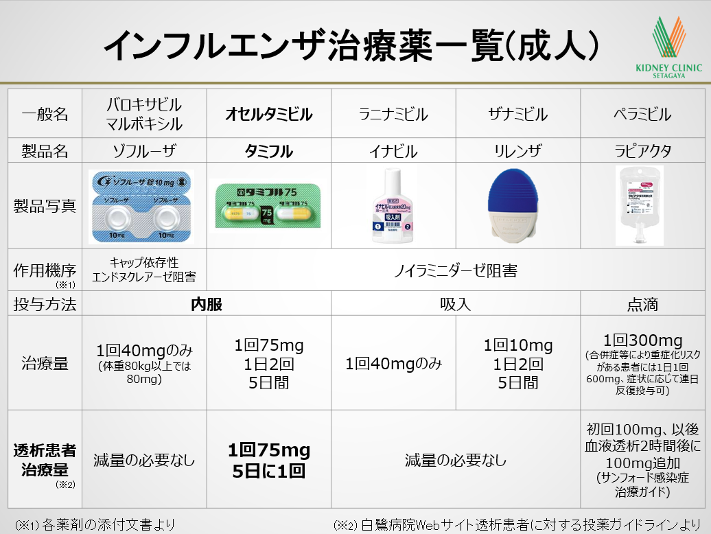 但し、腎排泄型の薬剤であるオセルタミビル(タミフル)は透析患者様の場合は血中濃度が上昇し1カプセル内服で済むことも多く、早期治療開始が効果発揮や重症化予防に寄与することも考えられ、引き続き本院では活用して参りたいと存じます2)。