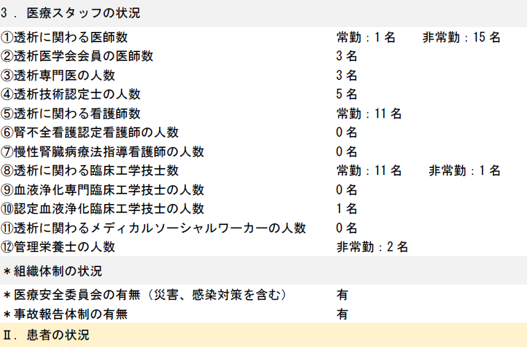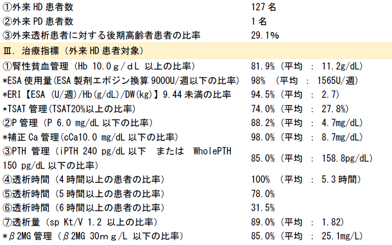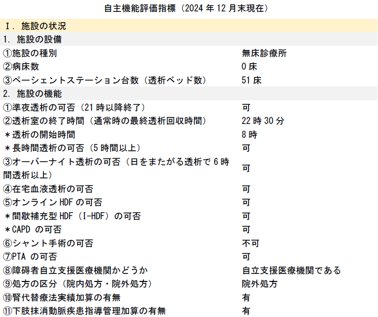 本院も施設会員となっております日本透析医会は自主機能評価指標の項目を選定し、自律的に自らの診療内容や医療の質の評価を公開することを勧めており、本院でも選定された全ての評価指標項目を公表しております。